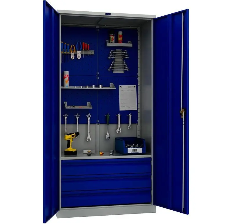 Инструментальный шкаф TC-1995-041030 предназначен для хранения инструмента, приспособлений, запасных частей и различных материалов в мастерских, гаражах, заводских цехах и производственных помещениях.Вы можете скомпоновать свой собственный шкаф для инструментов TC-1995 в соответствии с вашими нуждами, выбрав и наиболее удобным образом расположив внутри шкафа необходимые вам комплектующие: перегородки, ящики (до 12-ти больших или до 24-х малых), полки двух видов и перфорированные экраны.